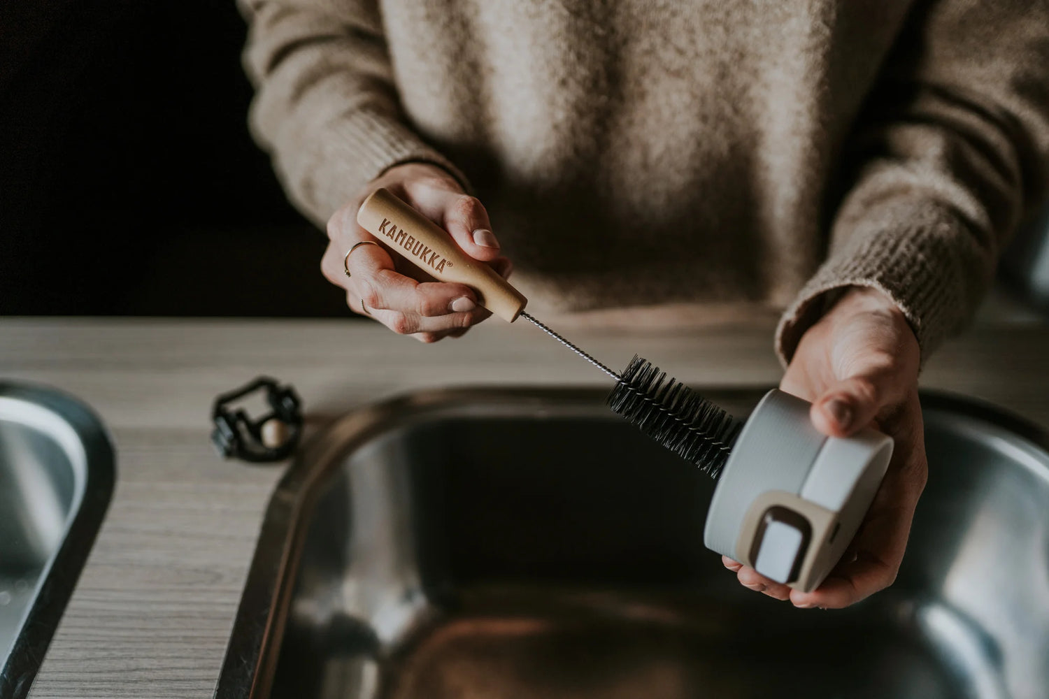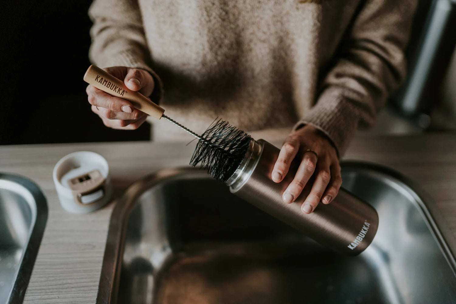 Wil je een blinkend schone fles? Geef je Kambukka een goede wasbeurt tussen het gebruik door. Vul hem tot boven met heet zeepsop en gebruik de grote schoonmaakborstel. Om je fles weer glanzend en als nieuw te krijgen, hebben we trouwens ook een borsteltje ontworpen om in alle kleine hoekjes te komen.